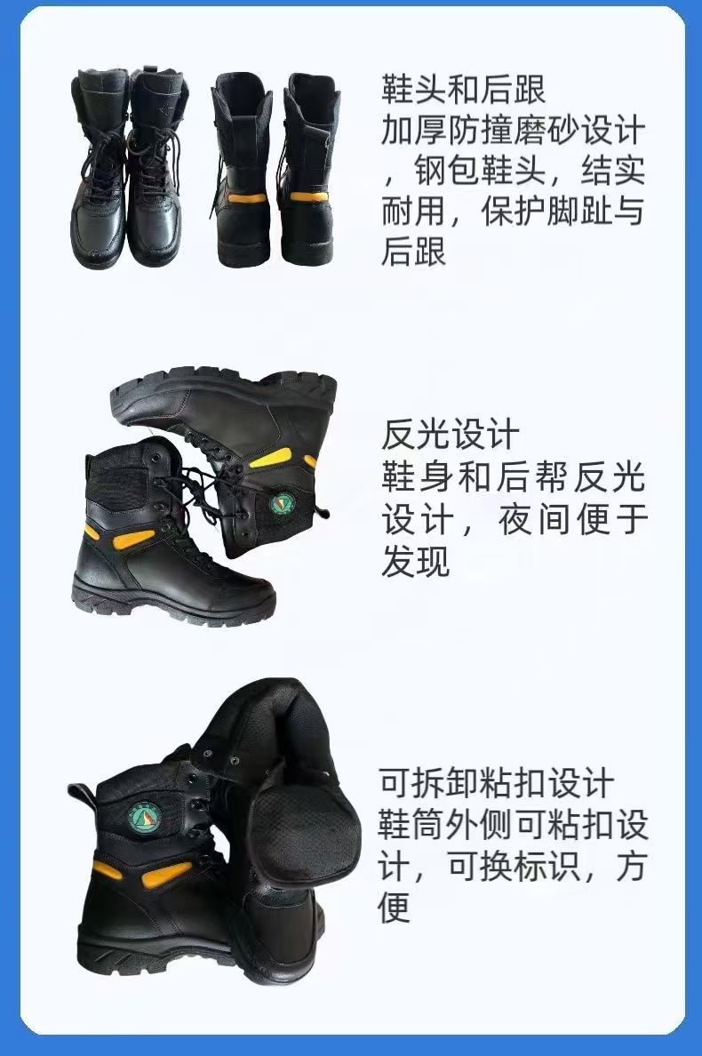 防滑耐磨:靴底設計有深紋路和特殊橡膠材質,增強在泥濘、濕滑地麵的摩擦力,減少滑倒風險。